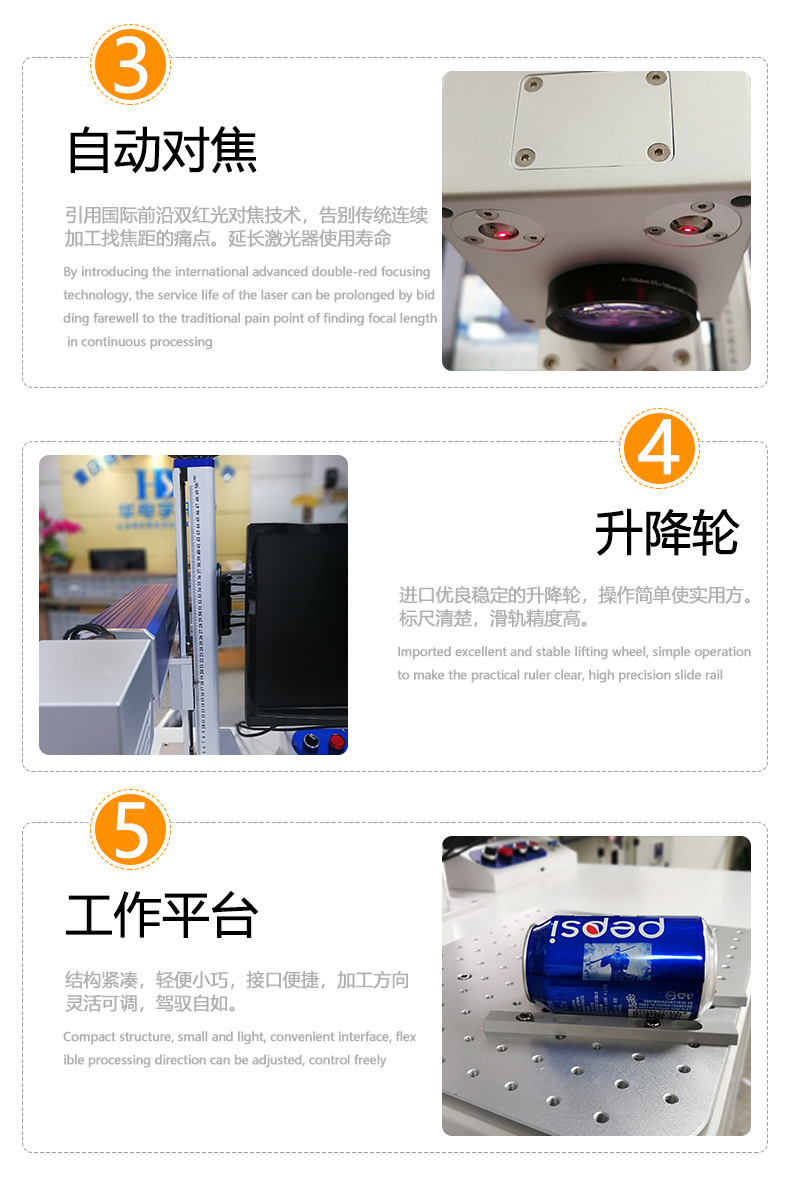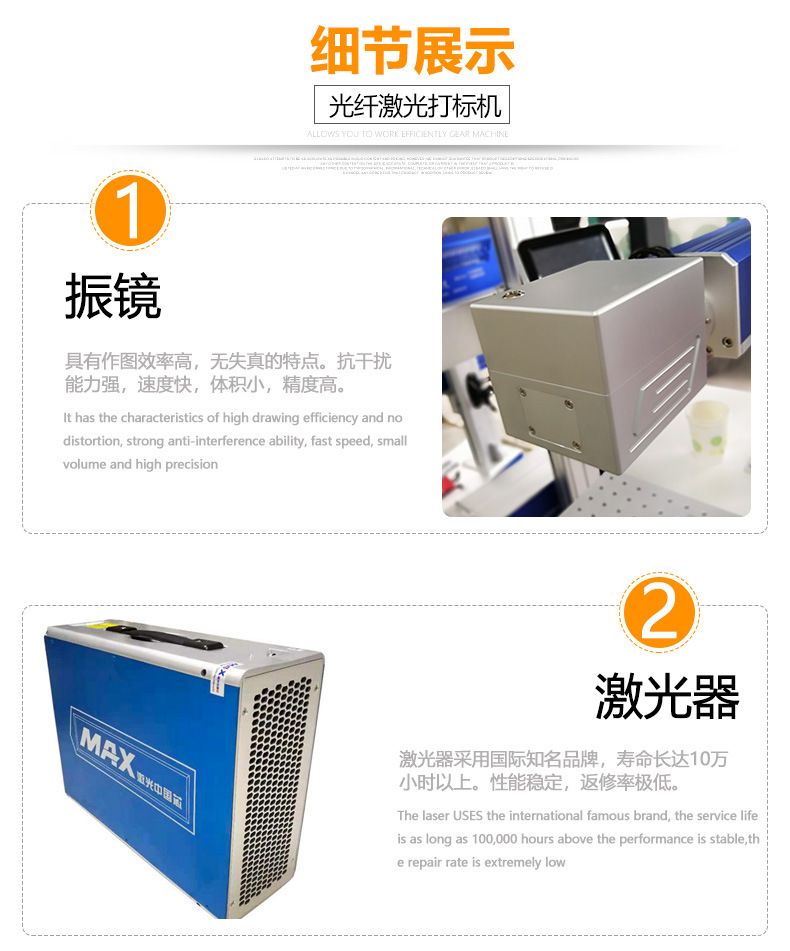 光纖激光打標(biāo)機(jī)采用光纖激光器,振鏡掃描系統(tǒng),輸出功率穩(wěn)定,光學(xué)模式好,光束質(zhì)量優(yōu)異、打標(biāo)速度快,效果好,效率高,能充分滿足客戶大批量生產(chǎn)需求。